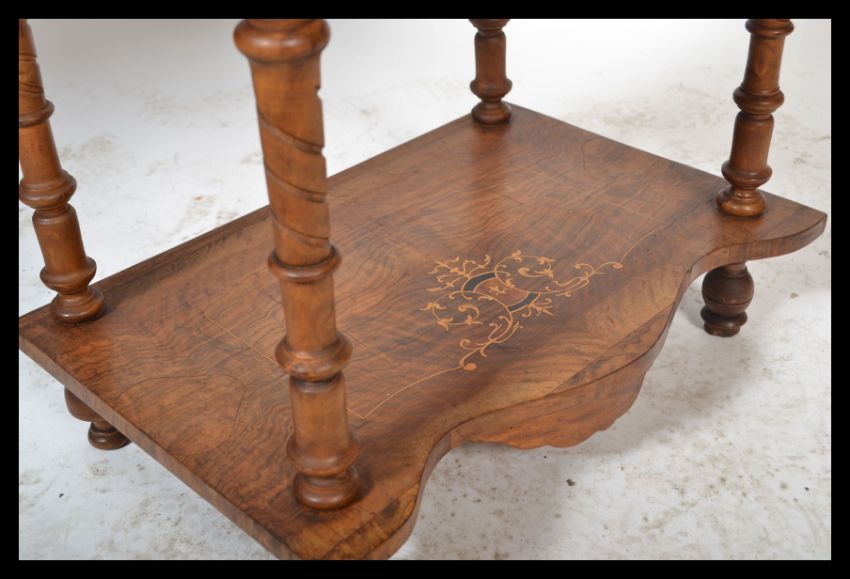A 19th Century Victorian walnut and marquetry inlaid three tier etagere / wotnot inlaid with scrolling motifs within marquetry borders, turned  column supports.