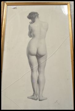 A collection of three framed and glazed portrait nude studies of the female form, a Van Hove nude print and an unsigned pastel sketche.