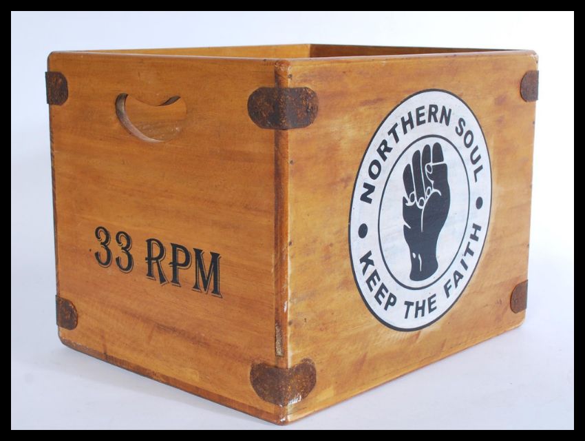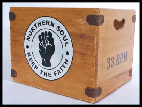 A vintage retro 20th century vinyl record storage box with logo for Northern Soul. Measures 28.5 cm high, 37 cm wide and 30 cm deep.