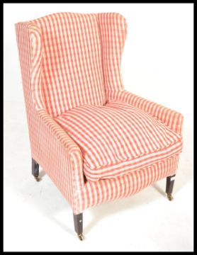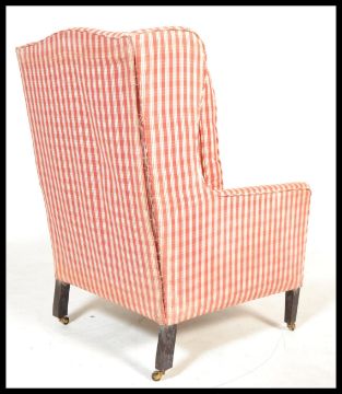An early 20th century Edwardian mahogany wing back armchair raised on square tapered legs with brass castors. Upholstered in a Gingham red and white check fabric with loose cushion.