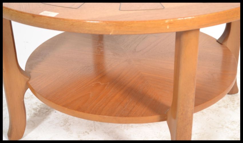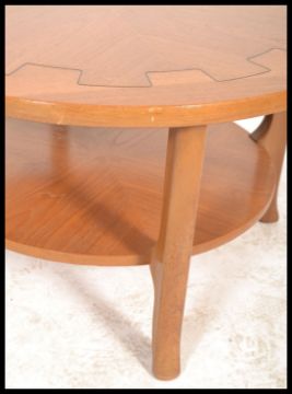 A 1970's teak Danish influence coffee table of circular form having inset lined cartwheel / cog design to the top. Measures: 52cm x 86cm.