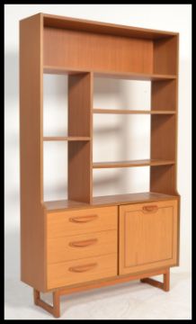 A mid century teak wood veneer Stateroom room divider bookcase / upright cabinet. Raised on shaped legs with a series of drawers and cupboard with shelves atop. Makers label inside door. Measures: 177cm high x 107cm wide x 40cm deep.