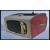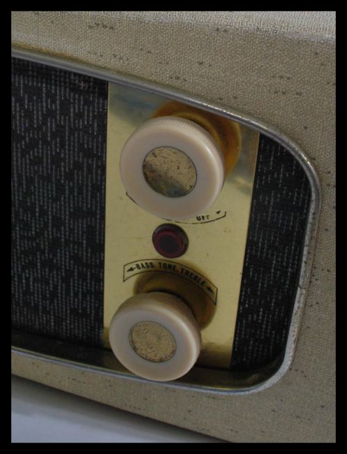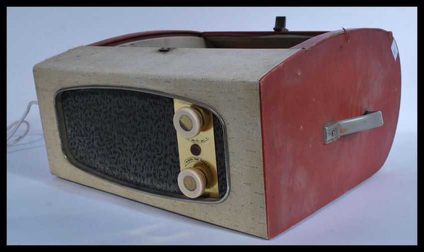 A mid century Monarch two tone portable record player in red and white colourway with unusual tambour rolling top complete with the handle. Measures 25 cm x 40 cm x 50 cm.