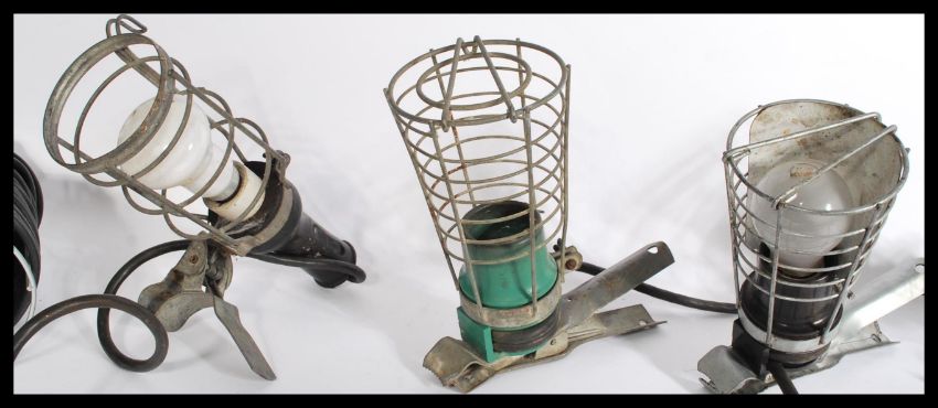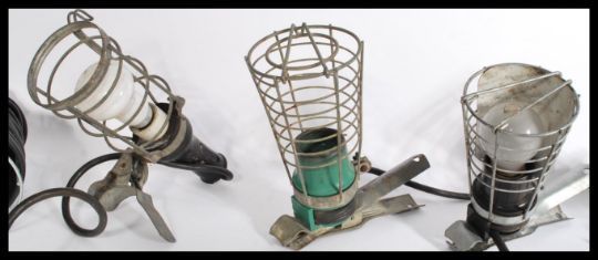 A group of five vintage 20th century inspection lamps having wire cages. Various styles with clip on mounts and cage light protectors