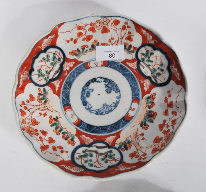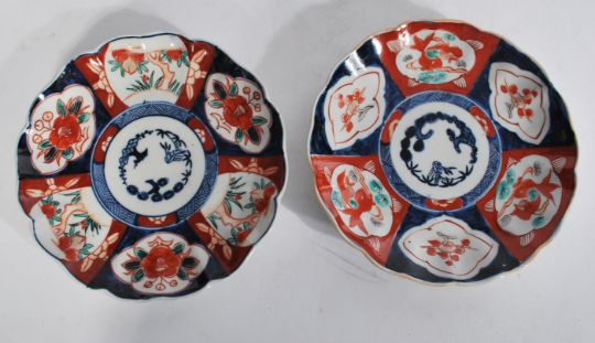 A group of early 20th century Japanese Imari chargers of scalloped form having hand painted scenes. Please see images.