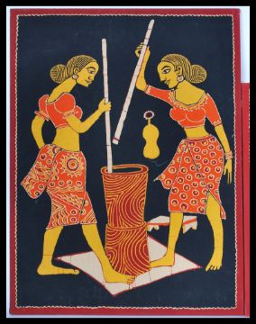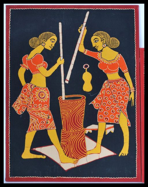 A group of three vintage 20th Century Indian / Asian screen prints depicting different scenes to include dancers, lady milking a cow etc.