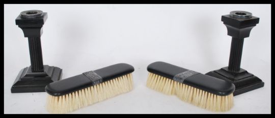 An early 20th century Art Deco ebony and silver mounted boudoir dressing table set consisting of two candlesticks and two brushes. The candlesticks raised on stepped square bases with reeded columns and the brushes of typical form with chased silver mounts with scroll and acanthus leaf decoration. Hallmarked for London 1910 makers H F Daltrey & Co.