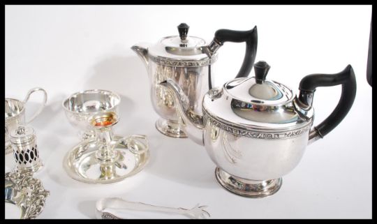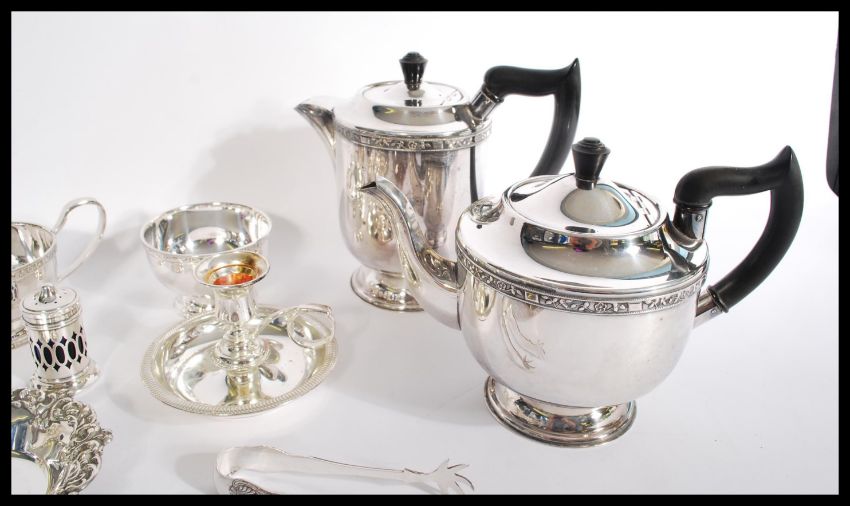 A good silver plated four piece tea service marked for Viner's together with a silver plated sauce boat with scroll handle raised on hoof feet etc.