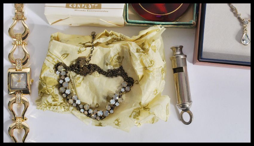 A collection of vintage costume jewellery to include Job Richard necklace , bangles , watches , brooches , Berlin compact , etc. Please see images.