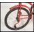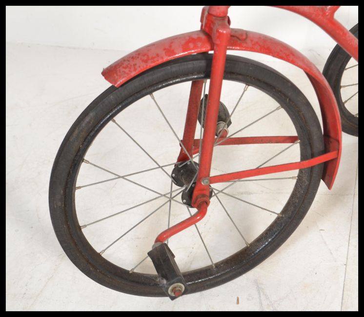 A retro vintage kids push bike / tricycle having a red painted frame metal seat and peddle attached to the front wheel.