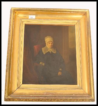 A 19th century English school portrait study - oil on board painting of an elderly lady in mourning. Set within good gilt plaster and wooden frame. The painting, possibly Henrietta Branson, mother of George Ernest Branson, later Lord Mayor of Sheffield. Measures 47cms x 55cms ( frame )
