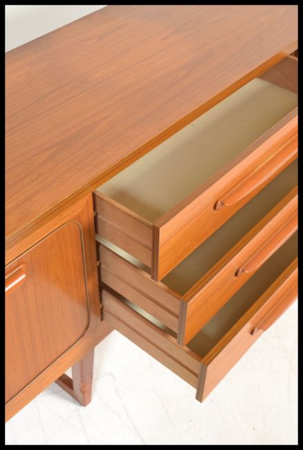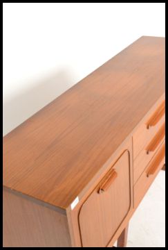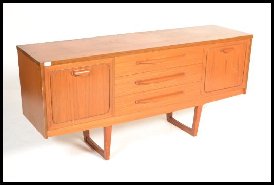 A vintage mid century teak veneer sideboard with 3 drawers to middle and doors on either side. Measures: 74cm high x 159cm wide x 43cm deep.