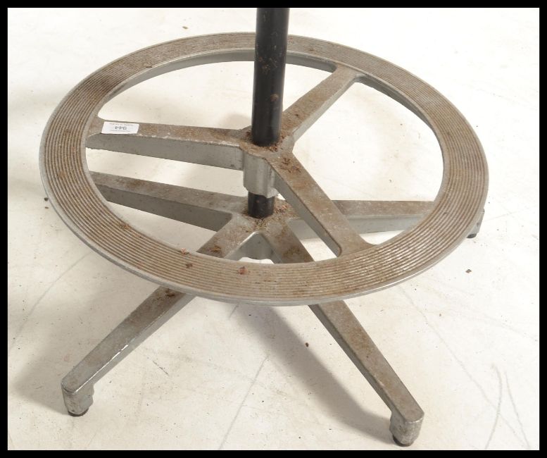A vintage early 20th century retro industrial engineers chair raised on a five point base with black vinyl seat and adjustable swivel movement. Measures 43cms wide by 57cms at base.