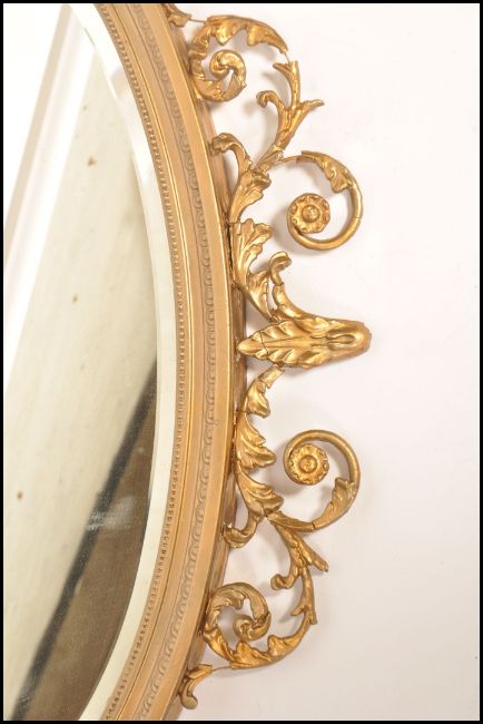 A 19th Century Adams Revival oval mirror with gilt plaster wire work and wooden frame ornately decorated with drop swags and large urn top finial, the mirror with bevelled glass in oval frame with further rococo scroll work plaster. Measures 97cms x 90cms