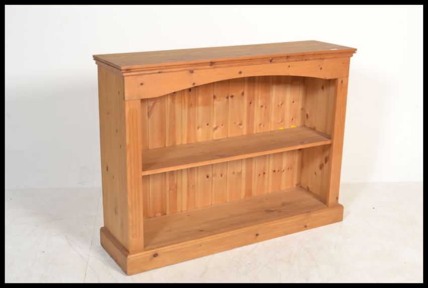 A 20th Century pine open bookcase fitted with shelves to the inner frame, raised on a plinth base and finished with a flared top above