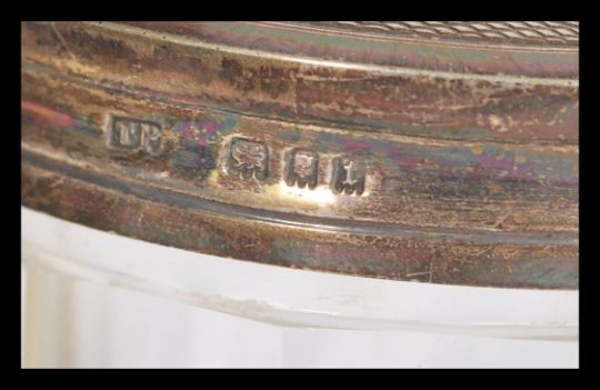 A set of silver hallmarked art deco dressing table items to include faceted glass pots , brush and comb cover having engine turned decoration. Hallmarked for London 1934.