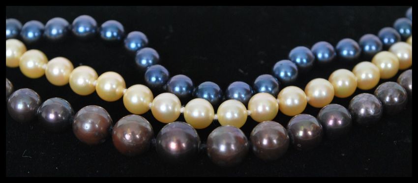 A group of three freshwater pearl necklace strands in black blue and cream. The black pearl necklace having a 14k white gold clasp , the others having 9k gold clasps.