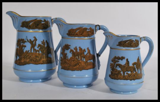 A 19th century Victorian set of three graduating prattware / pratt ware jugs having blue ground with printed hunting scenes. Measures 18 cm high.