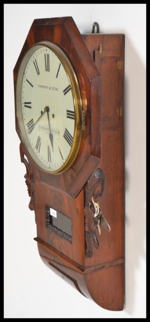 A late 19th century mahogany cased double fusee wall clock, the dial with makers inscription Tanner & Son of Cirencester with visible pendulum and key.