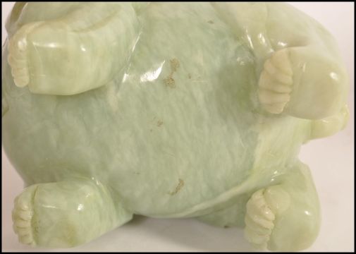 An unusual large Chinese Jade fu dog - temple dog inkwell pot sculpture. The large carved model with shaggy mane and brest in seated position, the head lifting off to reveal a well. Measures 18.5cms tall