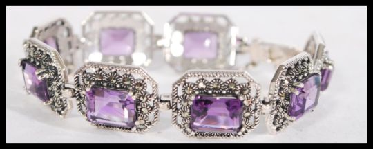 A sterling silver and marcasite amethyst panel bracelet having eight large paneled amethyst surrounded by marcasites.