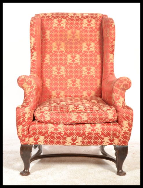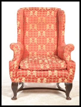 A 19th Century Georgian wingback armchair, the shaped toprail above a padded back and deep wings, over a loose cushion seat, raised on shaped cabriole legs united by a crinoline stretcher.
