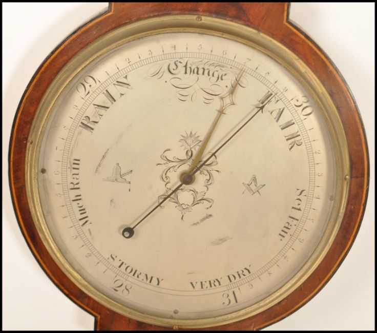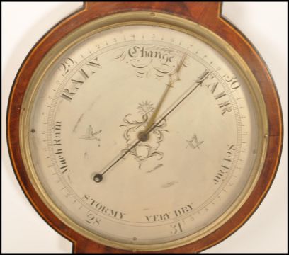 An early 19th Century mahogany and inlaid barometer / thermometer by Giobbio of Trowbridge and Devizes. The neck with alcohol thermometer over a silvered dial, large silvered circular dial over pull and  hemispherical cistern cover. Mercury filled complete with transport cork. Measures 114cms high