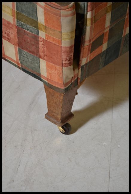 An Edwardian drop arm sofa / daybed on square tapered legs to brass caps and castors, with a later upholstery chequered fabric. Measures: 80cm high x 170cm wide x 80cm deep.