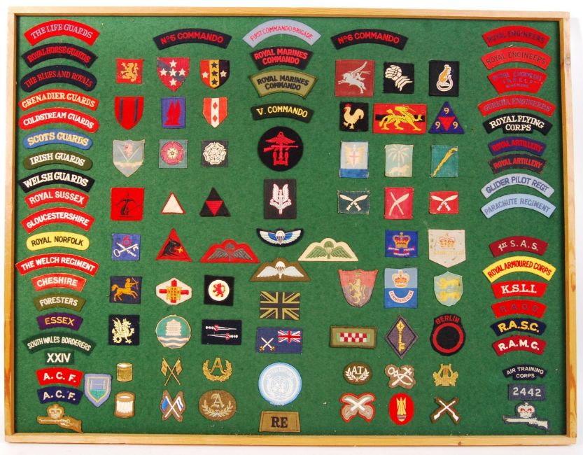 A collection of WWII Second World War and other 20th century conflicts British military uniform shoulder patches and combat patches form different regiments. Measures 72cm x 94cm.