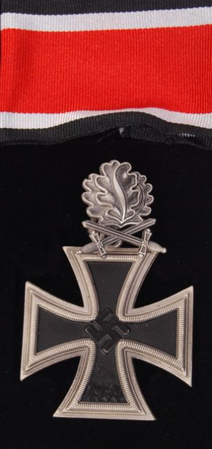 Two WWII Second World War style reproduction German Third Reich Nazi Party medals. Comprising: Knight's Cross - decorated with sword and oak leaves, and an Iron Cross (Second Class) medal. Both within presentation boxes.