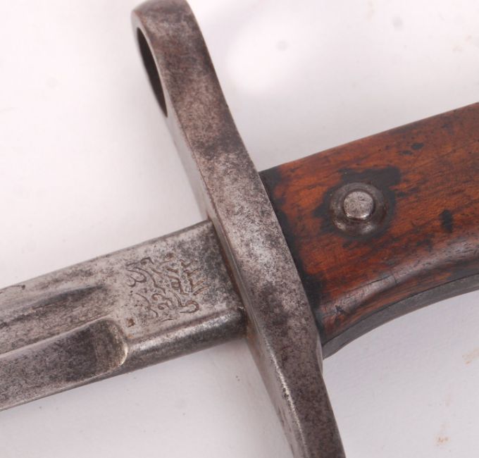 A WWI First World War 1903 pattern Turkish mauser rifle bayonet. Shaped quillon, with Turkish markings to the ricasso. Wooden grips, with locking button in working order. Largely very good condition. With original scabbard present. Measures approx; 65cm long.
