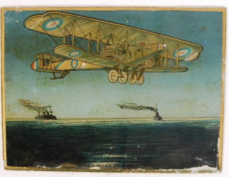 A pair of unusual post-WWI First World War era reverse-painted glass pictures. The first showing ' The British Airship R34 - The First To Cross The Atlantic From England To America 3100 Miles In 108 Hours 12 Mins. July 1919 ' and the second showing ' The British Aeroplane (Vimy Rolls Royce) The First To Cross The Atlantic From America To England - 1880 Miles In 16Hrs 27mins - June 1919 .' Both very well detailed, the Zeppelin being detailed with mother of pearl. Each measures approx; 15cm x 30cm. Rare and interesting objects.