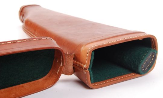 A 20th century Leg O' Mutton shotgun case in tanned leather, with white stitching and green felt lining. Measures; 77cm in length.