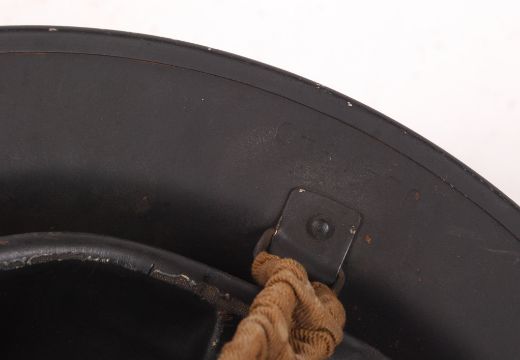 An original WWII Second World War British steel Civil Defence Brodie helmet. Black. Original liner and canvas chin strap present. Impressed marks to rim, dated 1940.