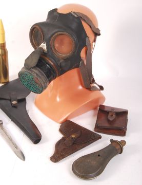 A good assorted collection of largely WWII Second World War militaria, comprising: a French WWII 25mm anti-aircraft round (inert), WWII gas mask, an antique Sykes Patent musket powder horn (AF - several holes in body), a 20th century short rifle bayonet (no makers marks), a collection of 4x assorted period leather gun holsters and a small leather ammunition pouch. A rare and interesting collection.
