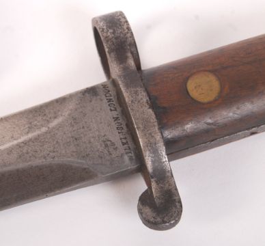 An antique British 1888 Lee Metford rifle bayonet by Wilkinson. Manufactured for the British .303 calibre Enfield, Lee Metford rifle. The bayonet blade double edged and unfullered with a medial ridge running from the ricasso to the blade tip. The ricasso of the blade marked 'Wilkinson London'. The reverse is stamped with the broad arrow and an inspection stamp. The grips are of wood, held together with two brass rivets. With scabbard. Measures approx; 44cm long.