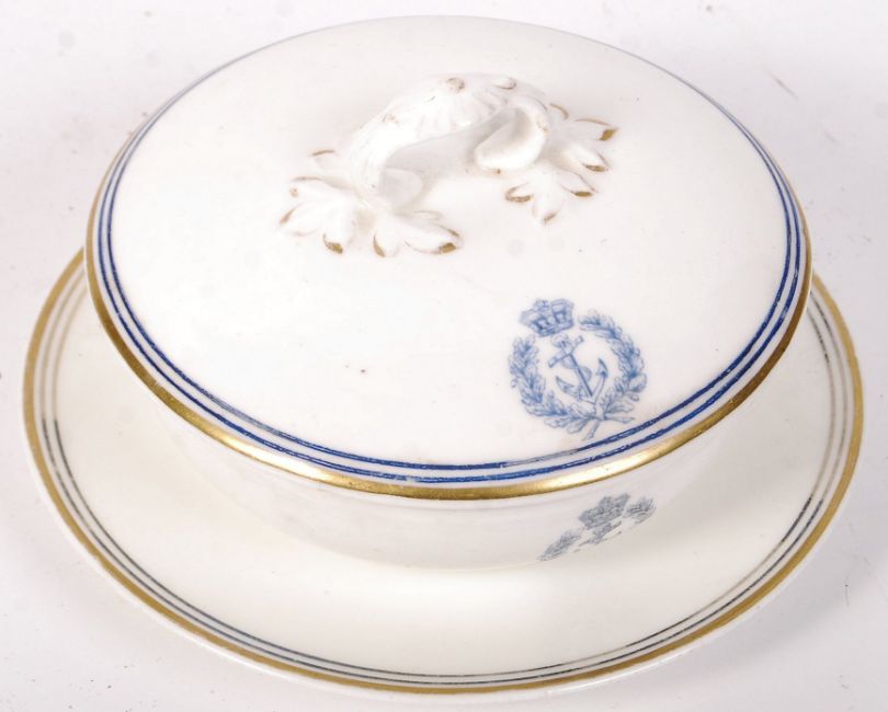A rare Edwardian c1907 Naval / Admiralty covered dish and saucer. Made by Copeland, with makers marks to base. The saucer, dish and lid decorated with a fouled anchor with crown atop. Blue and gilt banding to all. No cracks, chips or breaks - some discolouration and rubbing to the banding. Rare and fine example. The saucer measuring approx; 18cm diameter.