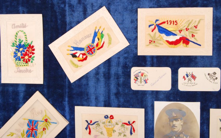 A WWI First World War soldier's remembrance / commemoration display. Unfortunately, the soldier is unknown. Comprising of a photograph of the soldier in uniform (a member of the Royal Artillery), and various silk postcards sent home. None of the cards or photograph are annotated, and all are stuck down to the silk presentation board (some loose to corners). Along with a miniature WWI First World War medal trio pinned to the display. Measures approx; 56cm x 81cm.
