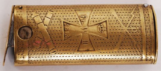 A rare antique 19th century Prussian / pre-WWI First World War interest match holder and strike. Brass construction, with hinged lid and compartment for matches. The bottom being a cigarette cutter, also hinged. The front decorated with an 1813 Iron Cross and cannon motif, and the verso with an 1810 Iron Cross motif. Rare. 7cm tall.
