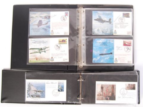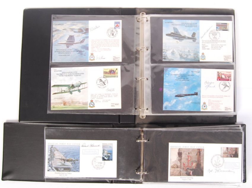 Two albums of approx 50+ assorted WWII related signed / autographed FDC's / First Day Covers. Various series, and each signed by a person of interest during the Second World War. To include pilots, crew members, serving members etc. Brian Daunt, Jozef Rusecki, Doug Nicholls, Air Commodore Widdows, and many others.