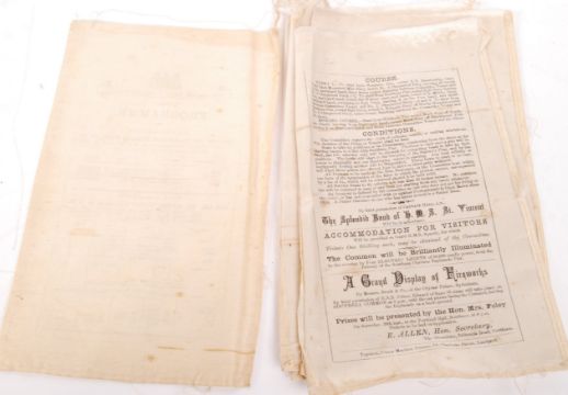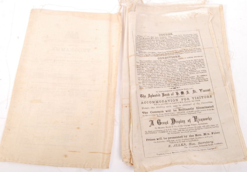 An incredibly rare Victorian (c1880's/ 90's ) ' Portsmouth Royal Dockyard Regatta ' silk Regatta and Fireworks programme / partial programme. The programme consisting of five printed silk pages (not bound, possibly missing covers) each list the prices for pleasure boats and yachts, a list of the accommodation details and ' A Grand Display Of Fireworks ,' and other details. Very rare. Exact date unknown.