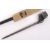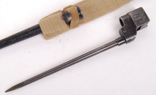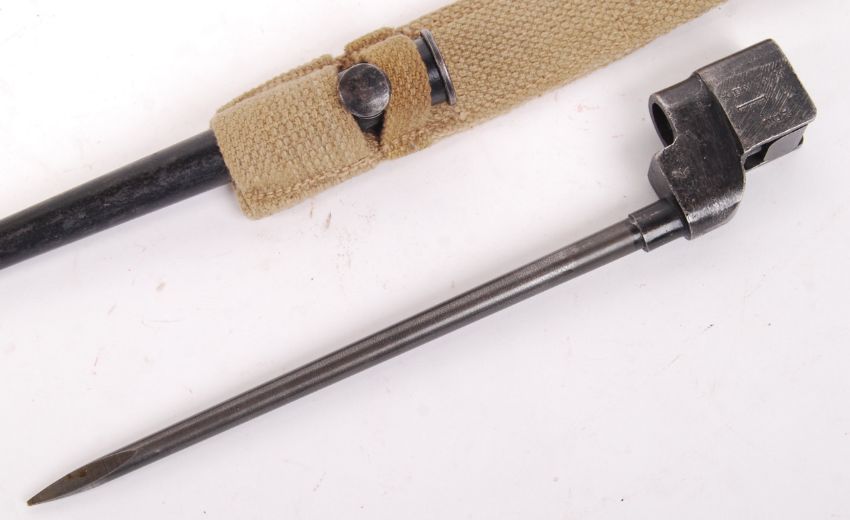 A WWII Second World War British ' pig sticker ' rifle bayonet. ' No.4 Mk II '. Complete with steel scabbard and canvas frog (dated 1943). Bayonet measures approx; 26cm long.
