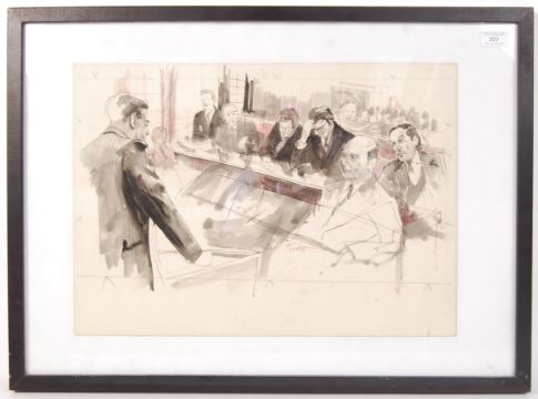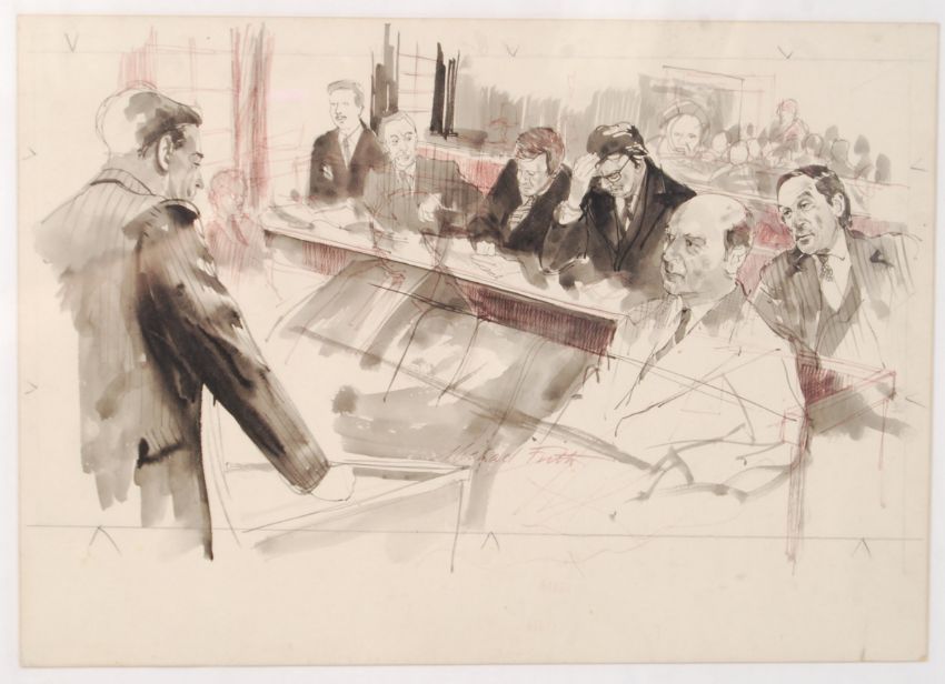 The Trial Of Jeremy Thorpe; An incredible piece of British political and social history - an original watercolour courtroom sketch by renowned British artist Michael Frith. The painting depicts Thorpe on the bench at The Old Bailey, listening to testimony as his defence council looks on. Several of the key figures involved in the case are depicted on the bench including - Peter Bessel, George Carmen QC, David Holmes, George Deacon and John Le Mesurier. Originally painted for broadcast as part of ITN's News Bulletin on the case. Signed to the central lower portion by Frith in red ink. The painting comes framed and glazed to a total size of: 54cm x 74cm.  John Jeremy Thorpe (29 April 1929 – 4 December 2014) was a British politician who served as Member of Parliament for North Devon from 1959 to 1979, and as leader of the Liberal Party between 1967 and 1976. In May 1979 he was tried at the Old Bailey on charges of conspiracy and incitement to murder, arising from an earlier relationship with Norman Scott, a former model. Thorpe was acquitted on all charges, but the case, and the furore surrounding it, ended his political career.