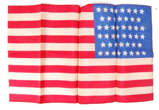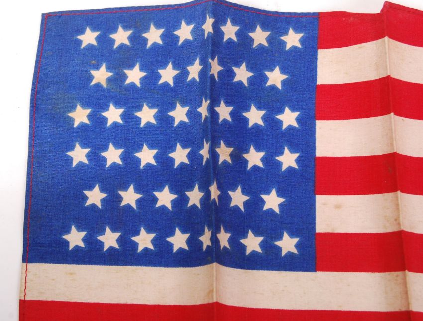 An antique early 20th century (1908-1912) forty-six star American flag / pennant. Small size - measuring approx; 19cm x 30cm. Likely a small flag for a carnival or similar. Silk construction. Generally good condition for age.