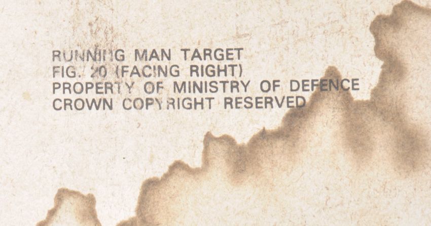 A rare post-WWII Second World War shooting range  ' Running Man Target ' in the form of a generic soldier printed on paper and backed to plywood with notation to bottom; ' Running Man Target Fig 20 ( Facing Right ) Property Of The Ministry Of Defense. Crown Copyright Reserved '. Measures 137cm x 61cm. Rare.