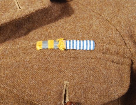 An original scarce post-WWII Second World War 7th Armoured Division ( Desert Rat ) uniform tunic. 1949 Pattern, Size 8. With medal ribbons affixed to the breast and Desert Rat patches to arms. Rare tunic.