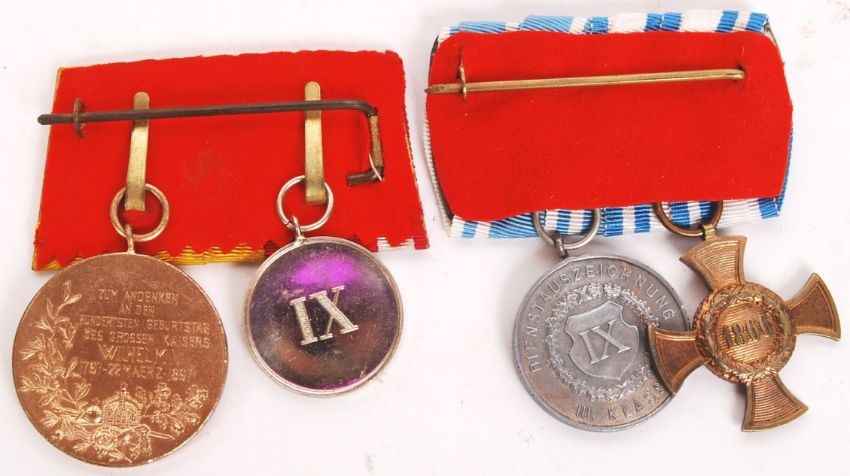 A collection of assorted Franco-Prussian War and WWI First World War replica and original medals. Comprising: An original Franco-Prussian War commemorative medal (1870-1871) with original ribbon, a replica medal pair - 1866 Cross and ' Dienstauszeichnung III Klasse ' medals, and another pair of replica medals comprising: Kaiser medal and Long Service medal. All with ribbons.