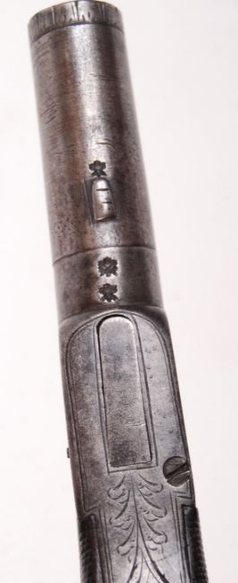 An antique early to mid-19th century percussion cap pocket pistol. The plate engraved for ' Booth , Durham '. Chequered wooden stock, with foliate engraved furniture. The hammer engraved in the form of a fish, with folding trigger. Proof marks to underside of barrel. Mechanism in full working order. Obsolete calibre. Measures approx; 15cm long.