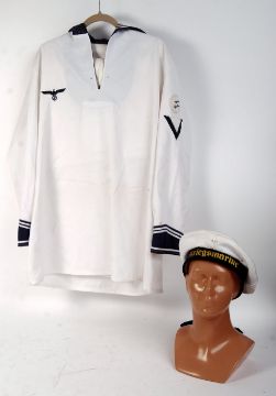 A 20th century reproduction WWII Second World War German Third Reich Nazi Kriegsmarine naval uniform comprising of a sailors cap and tunic in a white colourway.