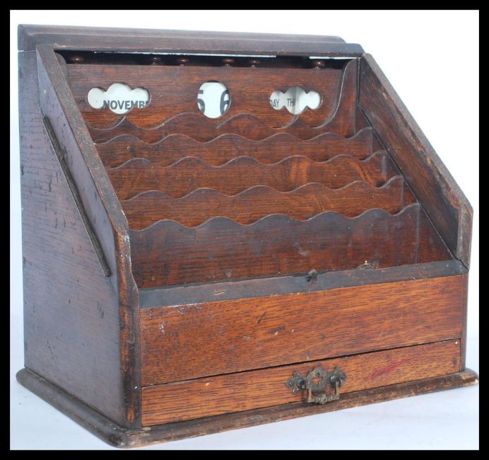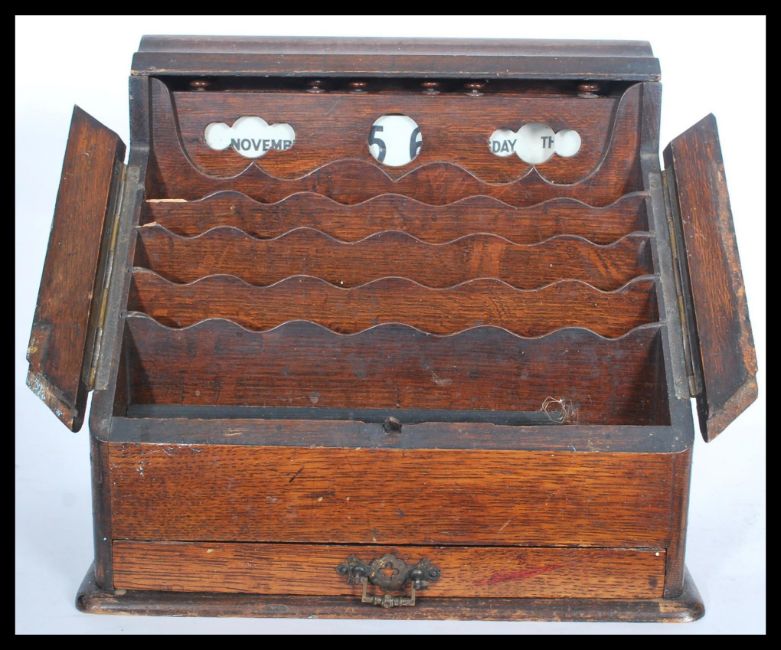 An early 20th century Edwardian oak desk calendar and stationary tidy compendium having fully appointed interior with changeable paper calendar to top. Set on a square base with drawer to front. Measures 29.5 cm high, 34 cm wide and 20.5 cm deep.